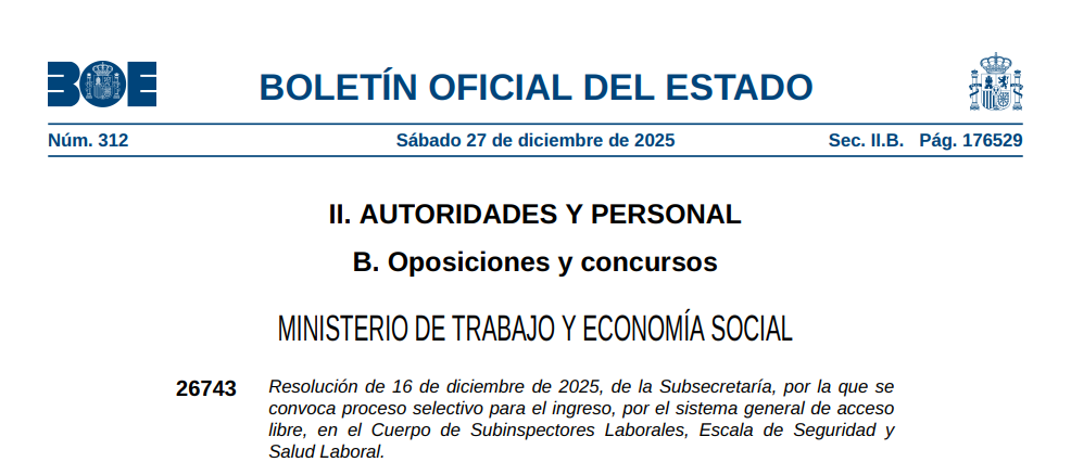 El plazo de presentación de solicitudes es de 20 días hábiles a partir del día siguiente al de la publicación en el BOE (27 Diciembre 2025)